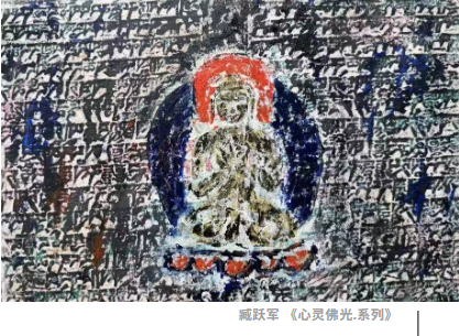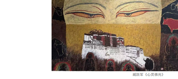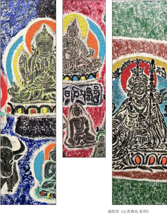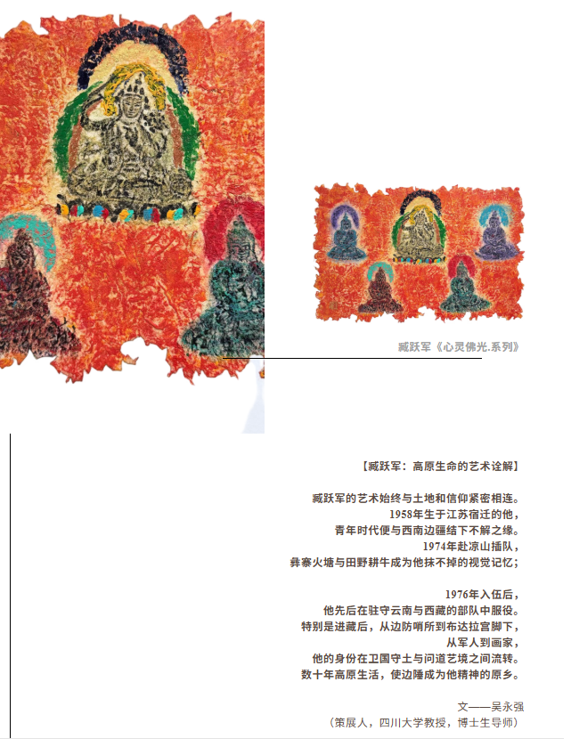 臧跃军将军旅生涯的坚毅与西藏文化的深厚底蕴融于创作之中,运用藏纸、藏香、矿物质颜料等综合材料,在传统与现代之间构建起独特的艺术语言。其作品斑驳陆离的画面背后,是艺术家对高原大地挚爱之情的真挚流露。